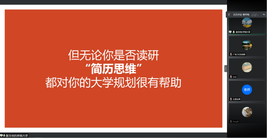 最后,张爱凤副院长和刘涛老师做出了总结,感谢董泽扬的倾情分享,并希望大家向优秀的人学习,多参加各大比赛,多积极与老师交流。主持人刘涛老师以“五个一”总结这次讲座,他认为大家要学会用一个简历思维去指导自己的发展规划,珍惜好大学这一个努力的周期,将优秀作为一种习惯,做任何事情需要有一个强大的灵魂,要追求一个更加高级的格局。