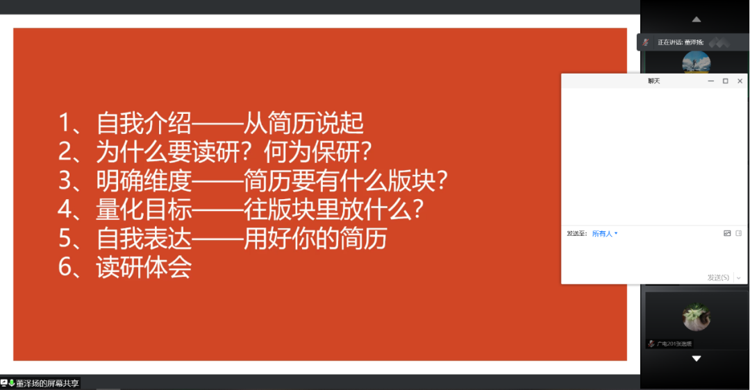 董泽扬,现为中国传媒大学新闻学院2020级学术硕士研究生,曾获评2017-2018学年度广州大学“十佳学生”等荣誉,本科在校期间获各类国家、省、市级奖项共计四十余项,发表论文三篇。从大一开始,董泽扬便开始有意识地规划自己的大学生活。在分享中,他将自身经历和经验总结为“简历思维”,毫无保留地为师弟师妹们分享如何学会用“简历思维”去规划接下来的大学生涯。整个分享以简历为轴,董泽扬分享了自己选择读研的原因和体会,也全方位地介绍了保研需要的各项准备事宜。