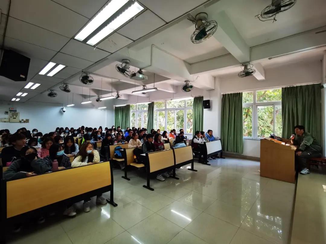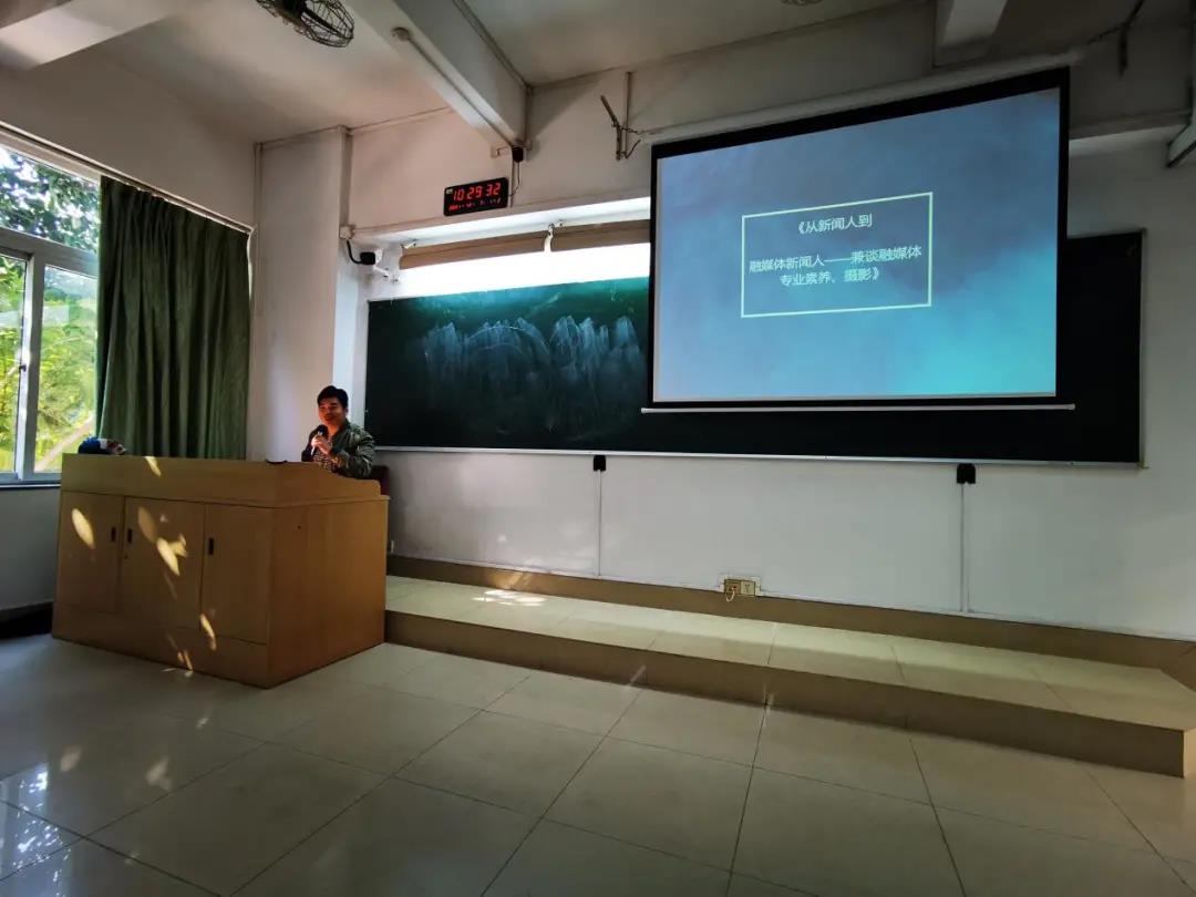 优秀校友——曹景荣,他现任广东省青年摄影家协会理事,广州日报飞行摄影俱乐部副会长,荔湾区摄影家协会副主席。曹景荣学长用专业而又幽默的语言给同学们带来了主题为“从新闻人到融媒体新闻人——兼谈融媒体专业素养和摄影素养”的精彩演讲。
